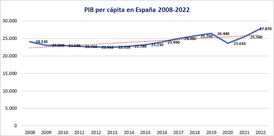 Tras el impacto de la pandemia en 2020, el PIB per cápita en España alcanzó en 2022, los 1.346.377 M€, posicionándose entre las 15 economías más importantes del mundo. Ahora bien, aunque el PIB nacional mide el tamaño de la economía de un territorio a través de su producción en un periodo de tiempo determinado, no resulta el indicador más adecuado para medir el bienestar, puesto que este depende también de su número de habitantes. Para ello es más preciso el PIB per cápita. En el caso español, el PIB per cápita nacional ascendía a unos 30.000 dólares estadounidenses en 2022, muy lejos de los valores registrados en otros países europeos con un alto nivel de bienestar económico como Luxemburgo y Suiza. (Statista, 2023)