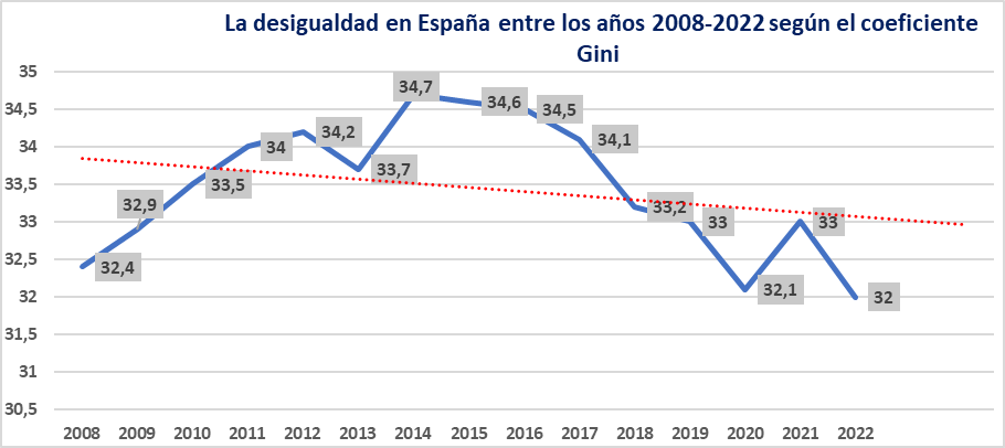 En el 2019, la desigualdad en España había vuelto a situarse en torno a los 32 puntos de Gini, pero, con los efectos provocados por la pandemia de Covid-19 sobre la actividad económica, y a pesar de las ayudas públicas, esos valores no solo no se han recuperado sino que, como ahora veremos, han aumentado.